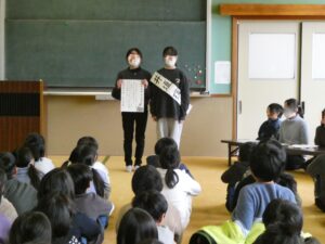 20日は次年度前期本部役候補の立会演説会がありました。4,5年生候補者、応援者はこの演説会に向け、ポスターの作成、タスキ作り、演説文やその発表練習を積み重ね、事前にリハーサルを何回も行い当日を迎えました。公約、そのための自身の強みや決意を具体的でわかりやすく表明しだれが当選しても立派な児童会役員となれるそんな発表でした。惜しくも落選した人もいましたが、その過程こそが大切です。当選者はその人たちの思いも二重に感じていることと思います。来年度の児童会活動が楽しみです。