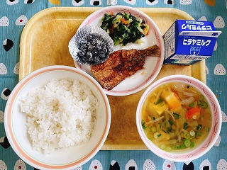 2月3日の給食は「ごはん、イワシのかば焼き、こんぶ和え、豆腐のすまし汁、黒豆のさとうがらめ、牛乳」です。