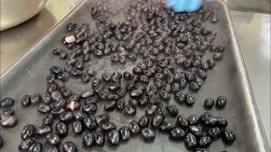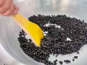 黒豆は当日朝に湯につけてもどし、オーブンを使って小1時間かけてこんがりと香ばしく焼き上げます。