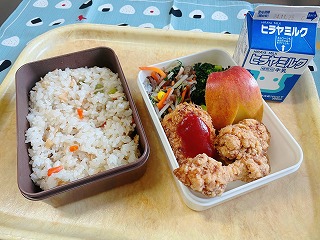 食後、調理員さんの方を向いて、大きな「ごちそうさま」の声がランチルームに響いていました。お弁当給食、大成功でしたね!
