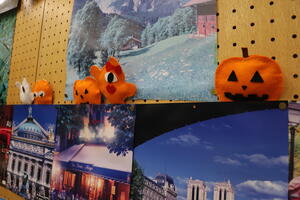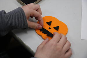 その後、ハロウィンにちなんだフェルトマスコット作りに挑戦。カボチャやゴーストなどの形に切ったフェルト2枚をボンドで貼り合わせ、中に綿を詰めて可愛らしいマスコットを完成させました。