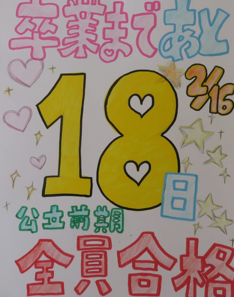 2月16日(月)、今日は京都府公立高校入学者選抜の「前期選抜」が行われました(高校によっては、今日と明日の2日間行われる学校もあります)。本校からは、3年生全体のおよそ半数の生徒が受検に挑みました。公立高校ですので、受検した全員が第一希望としての受検です。「あせらず、あなどらず、あきらめず」にこれまで取り組んできた学習の成果を十分に発揮できるよう頑張ってください。応援しています。学校では、残り半数の生徒が、受検している仲間を応援しながら、進路が決まった生徒は高校の英数国の内容の先取り学習にチャレンジし、この後受験(検)が控えている生徒はそれに向けた個別学習に取り組み、4校時までで下校しました。3年生は、「受験は団体戦」を合言葉に、みんなで乗り切ろうと頑張っています。