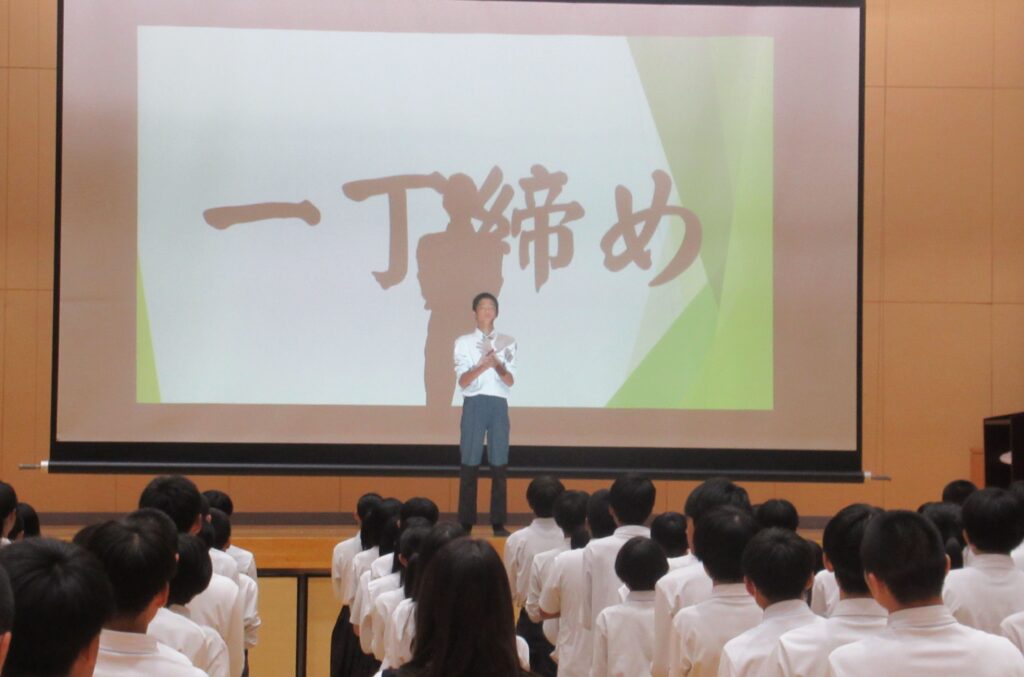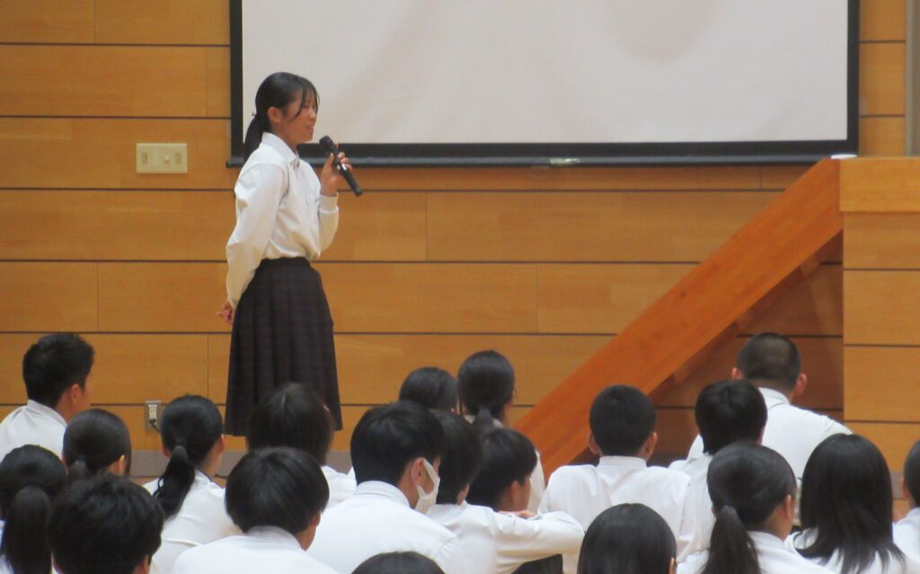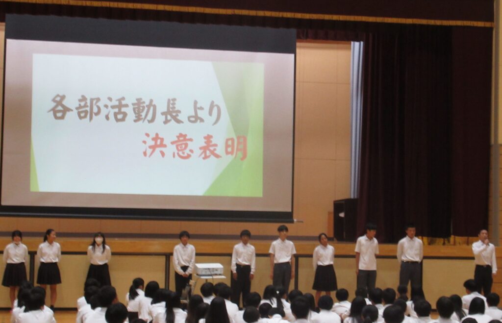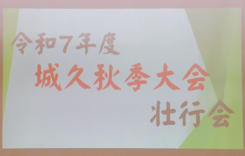 9月25日(木)、今日は生徒会主催で、明後日から始まる令和7年度 城陽・久御山中学校秋季大会の「壮行会」を実施しました。集合、整列、司会進行などすべて生徒の手で行いました。はじめに中学校体育連盟の担当からの連絡と諸注意、次に校長より激励の言葉とエールを送った後、各部活動長から大会に向けた意気込みなどの決意発表、その後、新部長長と副部長長の決意表明、旧部長長からの激励の言葉、最後に生徒会本部役員からの話と全校生徒で「一丁締め」を行い、大会に向けて校内の士気が高まる壮行会となりました。大会に参加する生徒の皆さん、「あせらず」、「あなどらず」、「あきらめず」に、また、いつも支えてもらっている家族、仲間、指導者、応援してくださる皆さん、大会運営の皆さんへの「ありがとう」という感謝の気持ちを大切に精一杯頑張ってください。目標としている結果を出せるように、また、新人大会なので、新チームがスタートして以降の活動を振り返り、克服していくべき課題を見つけたり、新たな目標を立てたりする機会となる大会にしましょう。皆さんの健闘と活躍を願っています。