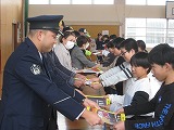 5年生が交通安全を呼びかけるポスターを描き、マグネットシートにしていただいたものを、地域の見守り隊の方や事業所のみなさまに授与しました。自動車に貼っていただき、多くの方が交通安全の意識を高めていただけるきっかけとなればうれしいです。