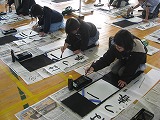 令和7年度3年生から6年生までが一堂に会し、書き初めの練習を行いました。初めに校長先生から書き初めの心得や各学年の課題のワンポイントアドバイスを聞きました。その後、それぞれの課題のお手本をよく見て、1画1画毛筆の穂先の動きや筆圧などに気を付けながら、書きました。冬休みの課題では、練習の成果を発揮し、新年の抱負や決意込めて、ていねいに書けることを願っています。