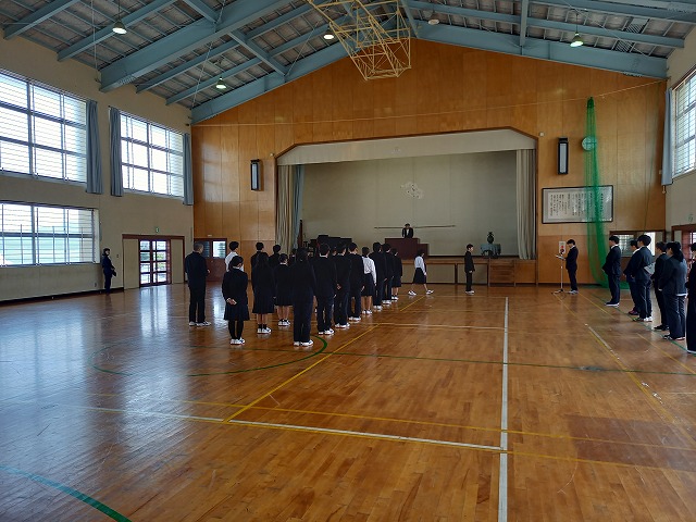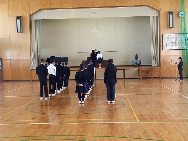 本日、令和7年度修了式を行いました。1年生、2年生の代表生徒が壇上で、修了証を受け取りました。