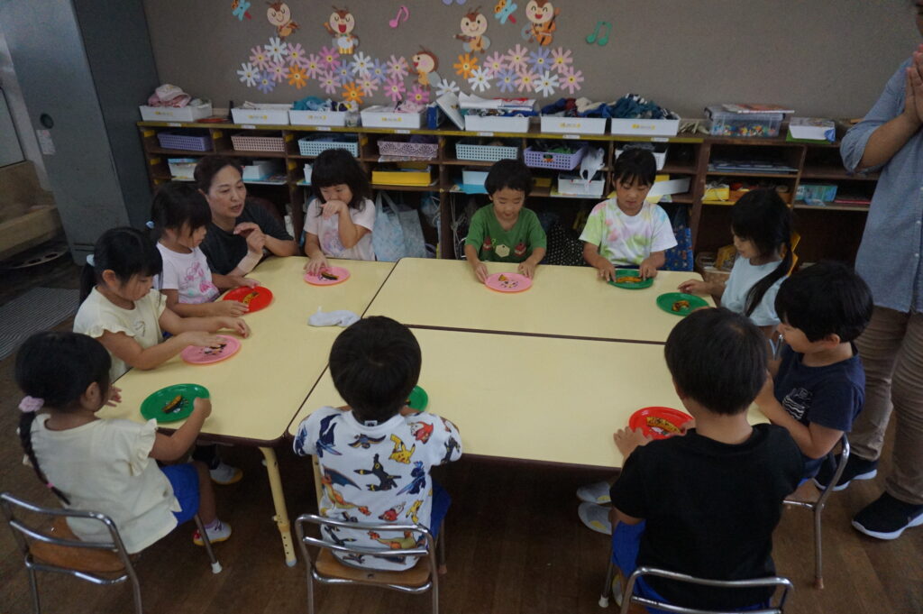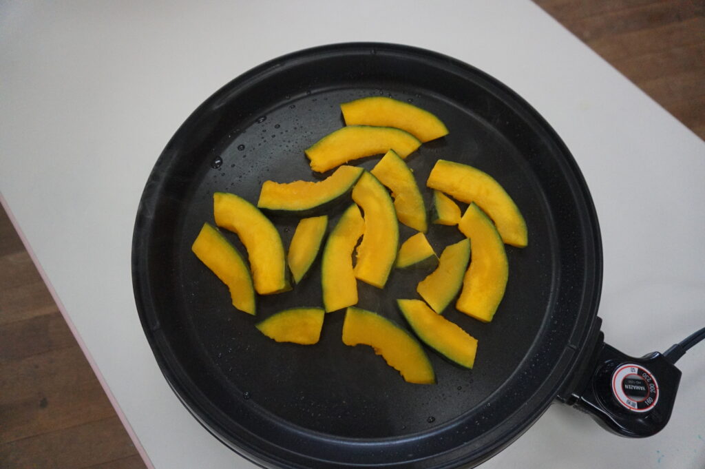 かぼちゃ試食 令和7年度 2025.10.03 9月12日(金)収穫したかぼちゃを薄切りにして、ホットプレートで焼いて試食しました。一口食べて、「あまい!」と大好評で、かぼちゃに苦手意識を持っていた子も、友達が食べている様子を見て、ちょっとかじって、「おいしい!」と、あっという間に食べ、おかわりも食べていました。冷凍して保存したかぼちゃは、冬に収穫した野菜と一緒にお味噌汁にするなどしていただく予定です。 Post Views: 24