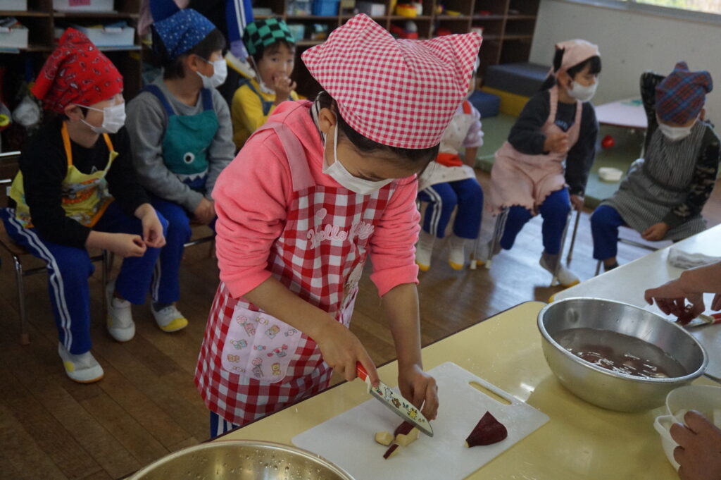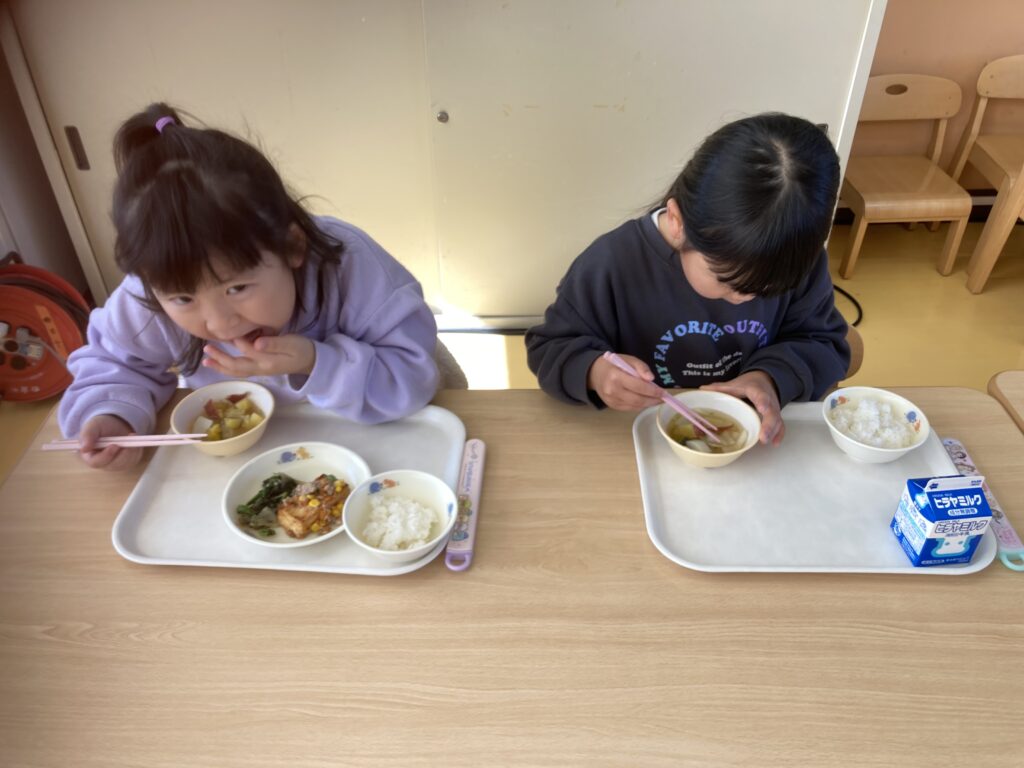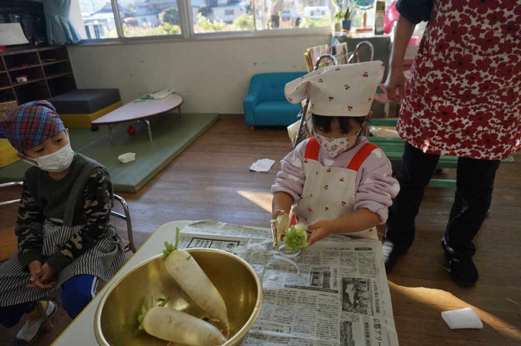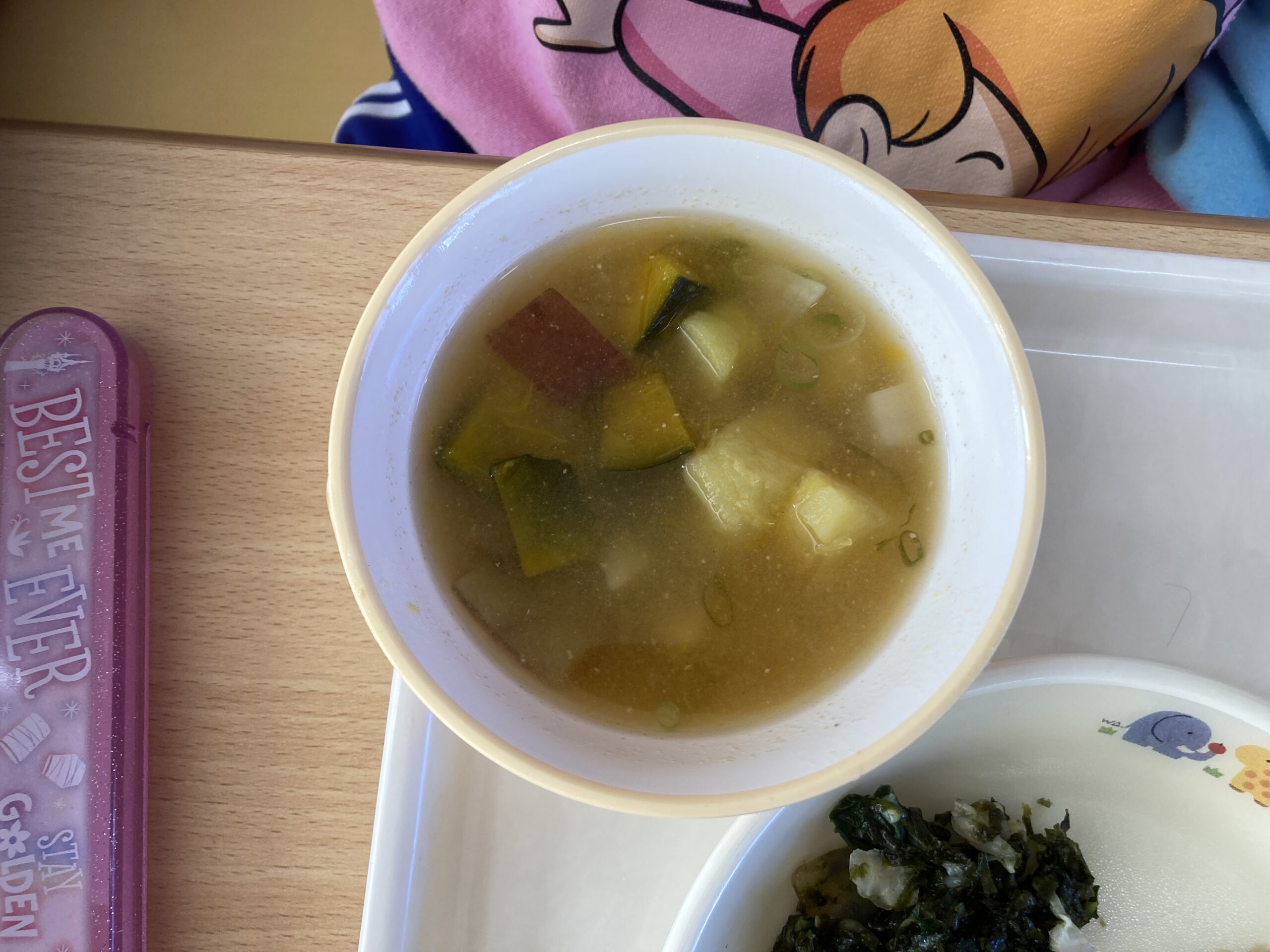 クッキング 令和7年度 2025.12.16 9月に植えた大根が少し大きくなり、12月15日に3本収穫しました。その3本の大根と、9月末に収穫したさつまいもと、木の上で大きくなったかぼちゃ(大事に冷凍してありました)、幼稚園で栽培した野菜を使って、お味噌汁を作り(子どもたちが皮むき、やさい切りをしました)、給食時にいただきました。野菜が甘く、とってもおいしく、「毎日食べたい!」という声が上がっていました。 Post Views: 5
