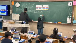 最近の様子 授業研 本日3校時、1年1組において算数科の授業研究会を実施しました。タブレット端末や数図ブロックを使って、この問題は、たし算するのか?ひき算するのか?について、一生懸命考えていました。 2026.01.28 最近の様子