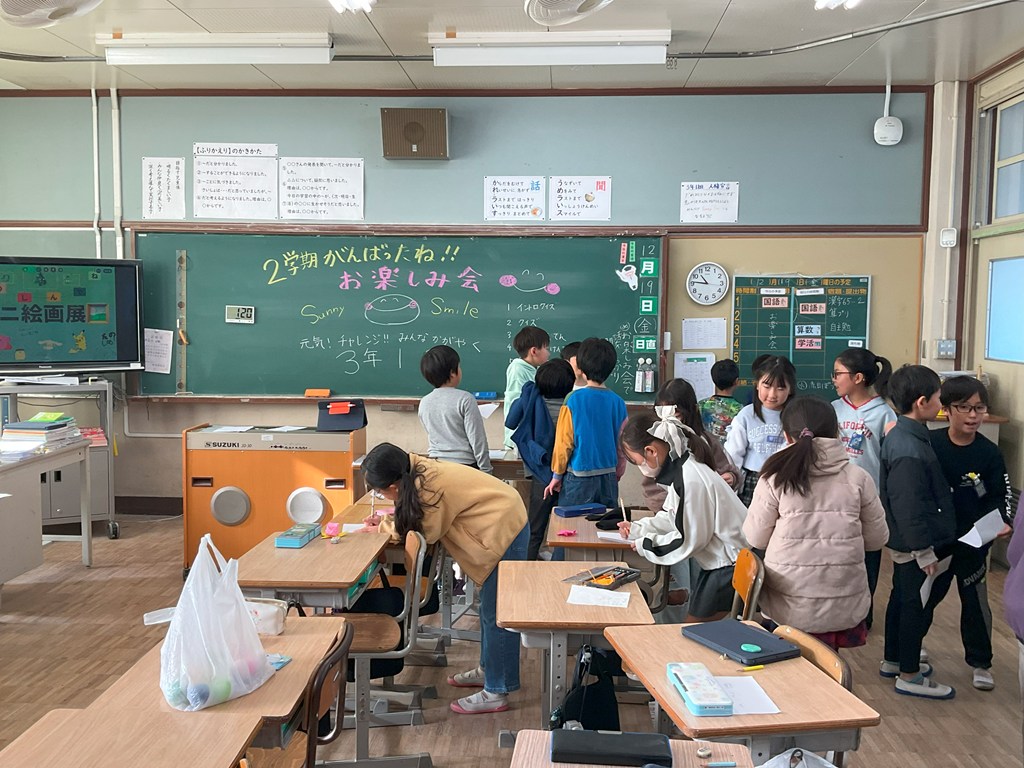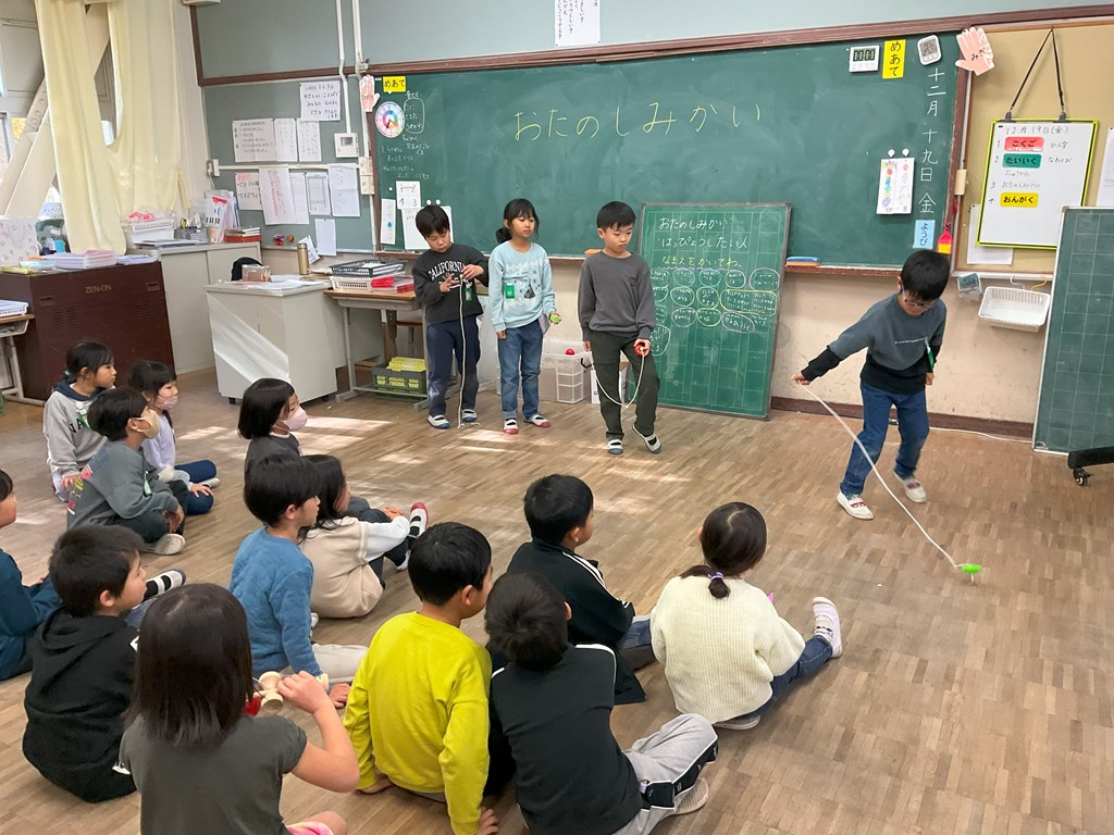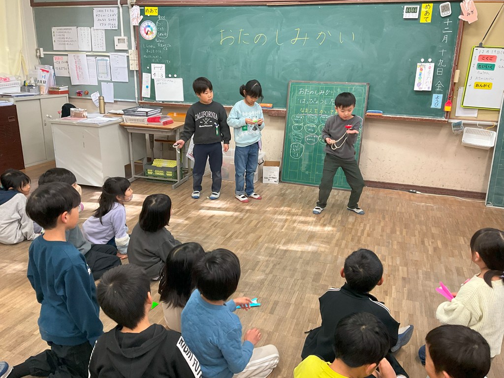 本日3校時、教室で開催している「お楽しみ会」を覗いてきました。1年1組は”ダンス”?、1年3組は”コマ回し”、3年生は”クイズラリー・絵画展・クイズ・お笑い等”で、みんなで盛り上がっていました。得意技を披露している場面が多く、完成度の高さにびっくりしました!