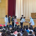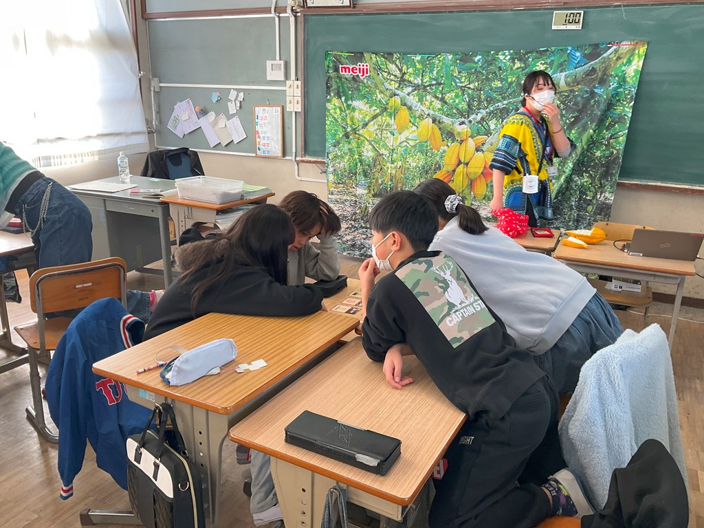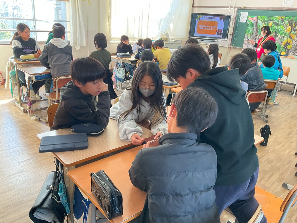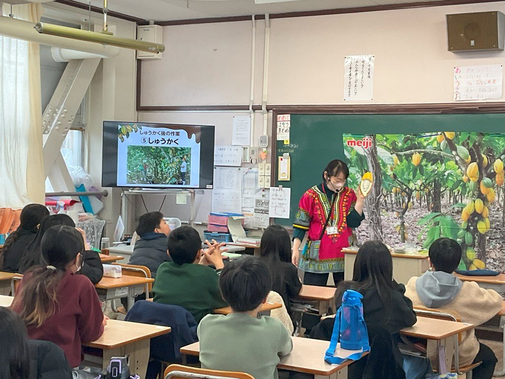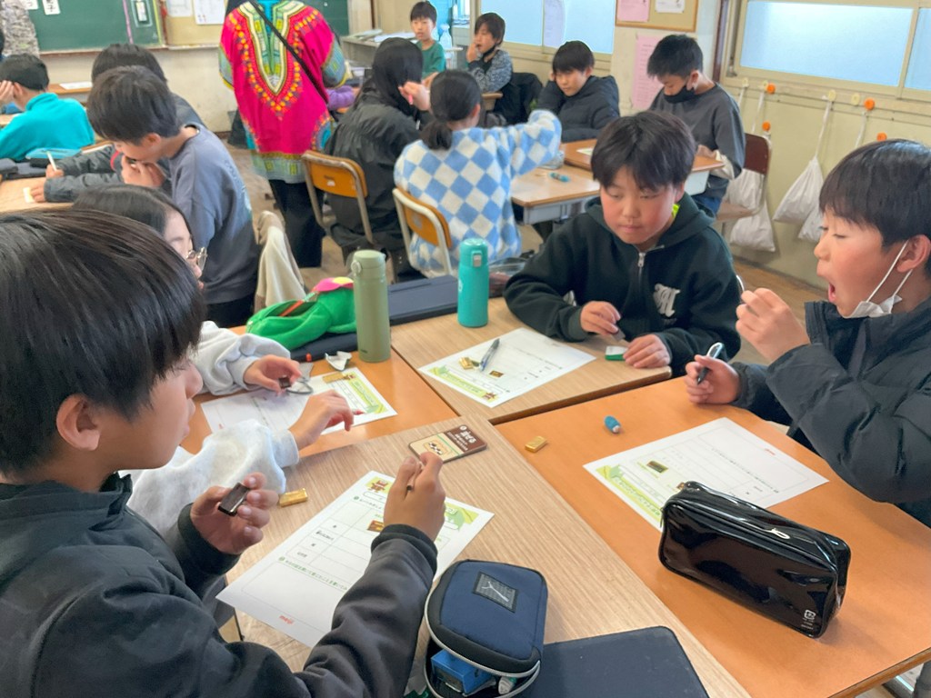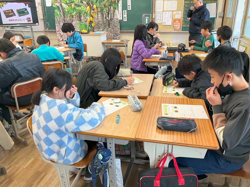 本日5,6校時、5年生が(株)明治の方にお越しいただき、「発見!チョコレートのひみつ」について授業をしていただきました。カカオからチョコレートができるまでについてグループで考えたり、実際に試食したりしました。試食では、2つのチョコレートの色、香り、味、とけ方について、まとめました。またガーナから日本(神戸)まで、船で2ヶ月かけて運ばれてくるんでしたね。