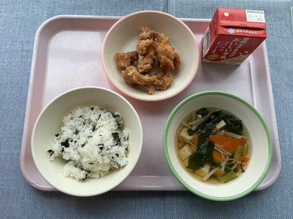 未分類今日から1年生の給食が始まりました。まず給食時間の準備の仕方を学習しました。みんな静かに一生懸命聞いていました。今日の献立は、大人気の唐揚げでした。「おいしい」「もっと食べたい」などの声がたくさん聞こえてきました。