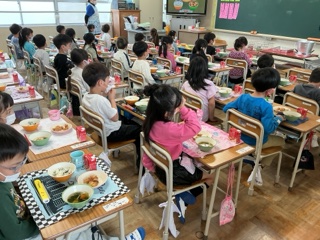 今日から1年生の給食が始まりました。まず給食時間の準備の仕方を学習しました。みんな静かに一生懸命聞いていました。今日の献立は、大人気の唐揚げでした。「おいしい」「もっと食べたい」などの声がたくさん聞こえてきました。