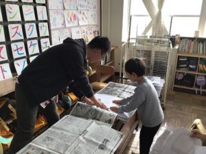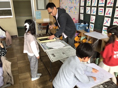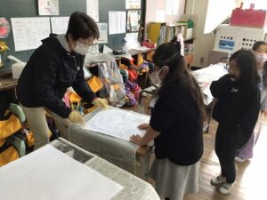 「かみはんが」をしあげよう 日誌 2025.12.03 1年生が図工をしている時間を、のぞいてみました。今回は、前の時間につくった「かみはんが」の台紙に黒のインクを塗って、作品を仕上げる時間。版画のテーマは「ぼくの、わたしのえがお」です。 担任の先生に黒インクを塗ってもらって、和紙をのせて手ですりすり。細かいところまでしっかりこすって和紙をあげると「えがお」の自分ができあがり、子どもたちはとても嬉しそうでした。 Post Views: 51