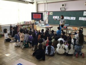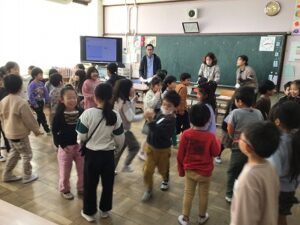 1年生も、英語の学習をしています。 日誌 2025.12.17 1年生の教室をのぞいてみると、1,2組合同で英語の学習をしていました。 AETのクロイ先生から、イギリスのクリスマスのことをいろいろ教えていただいたり、○×クイズをしたり、クリスマスに関わるカードを使ってゲームをしたり…。楽しみながら、自然にどんどん英語を口にしていました。クリスマスはもうすぐですね。 Post Views: 10