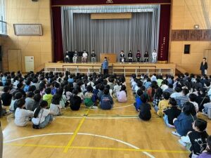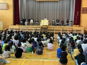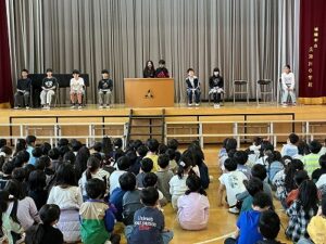 全校集会がありました。 日誌 2026.04.23 4月22日の朝に、今年度初めての全校集会がありました。 今回は、新しくなった各委員会の代表が舞台に立ち、それぞれの活動内容や全校へのお願いについて発表しました。どの委員会の代表も、また司会や挨拶をした本部役員もしっかり発表することができ、また全校の子どもたちも静かに話を聞くことができました。 これから、5,6年生は全校みんなのために、委員会活動を頑張ってくれます。そのことに感謝しつつ、みんなで協力できたらと思います。 Post Views: 16