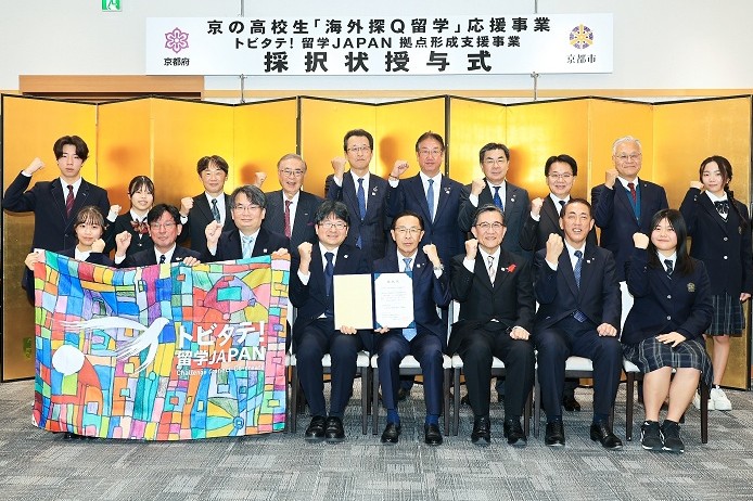 文部科学省のトビタテ!留学JAPAN「拠点形成支援事業」に京都府の『京の高校生「海外探Q留学」応援事業」が採択されたことを受け、12月23日の採択状授与式において、文部科学省から西脇京都府知事に採択状が授与されました。