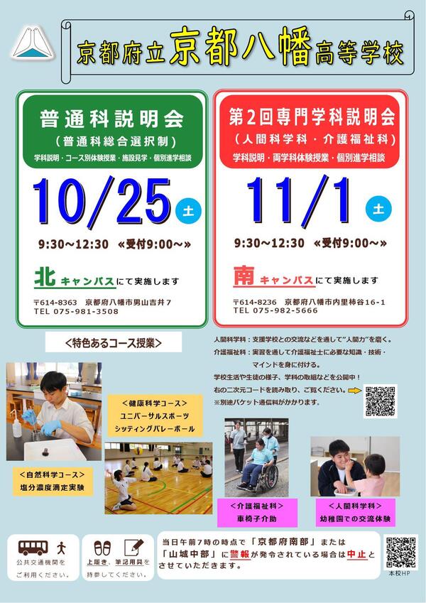9月23日(土)には南キャンパスにて第1回専門学科説明会、10月28日(土)には北キャンパスにて普通科説明会を予定しています。多数のご参加をお待ちしております。