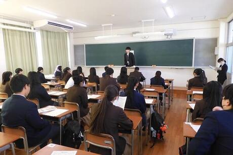 全体説明会では、担当教員から「普通科概要・入学者選抜について」、「学校行事・部活動・進路について」、在校生から「学校生活について」の話がありました。また、それぞれ希望する7つのコースに分かれ、本校の特色でもある「コース授業」を体験していただきました。コース授業体験後、希望者を対象に施設見学と個別相談を行いました。