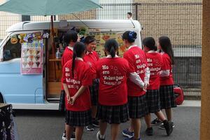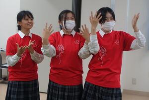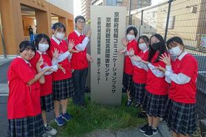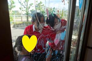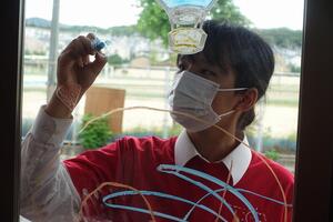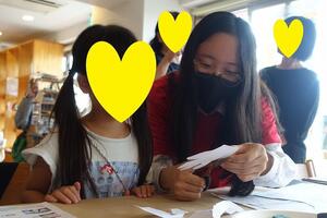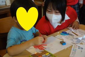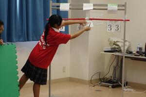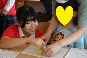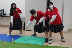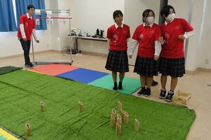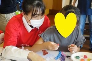 午後からは、2グループに分かれて「モルック体験」、「アート体験」のお手伝いをしました。モルックは、ボランティア部の活動で体験している馴染みのあるスポーツです。モルック(投げる棒)を参加者に渡したり、スキットル(木製のピン)を立てたり、得点係をしたり、応援をしたりなど、会場を盛り上げていました。「アート体験」では、自分の手形を画用紙に描いて切り取り、色を塗って指文字を作りました。自然と子どもたちに優しく寄り添う姿は、普段の活動の成果だと感じました。「ガラスアート」で子どもたちと楽しんでいる様子も微笑ましかったです。