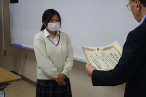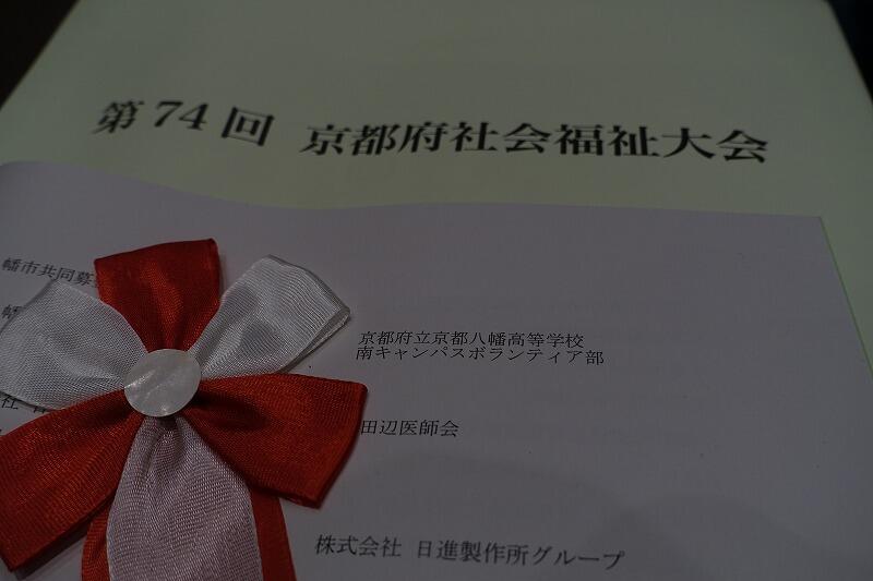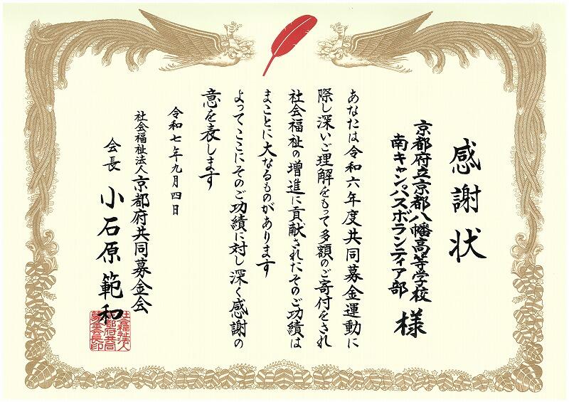 9月4日(木)、第74回京都府社会福祉大会(京都府等主催)が京都テルサで開催され、本校南キャンパスのボランティア部が、昨年度の共同募金運動に対する感謝状を(福)京都府共同募金会会長様よりいただきました。また、9月11日(木)には、(福)八幡市社会福祉協議会事務局長様からその感謝状を直々に授与していただきました。これを励みに、今年度も共同募金運動に貢献できるよう頑張ります。