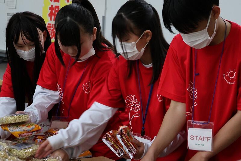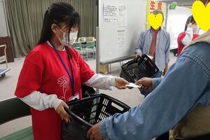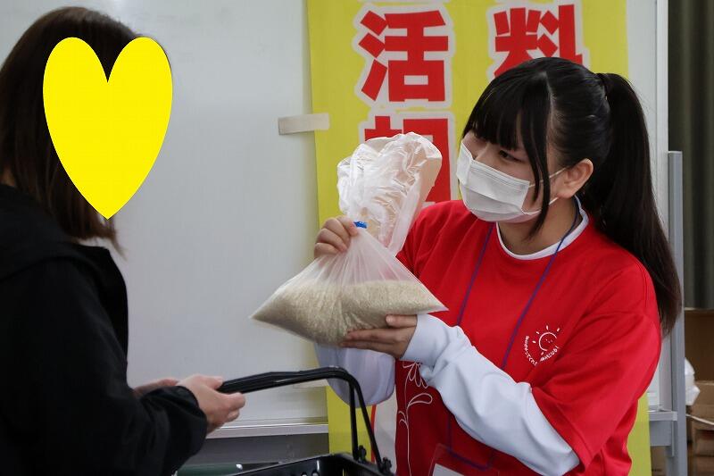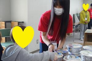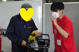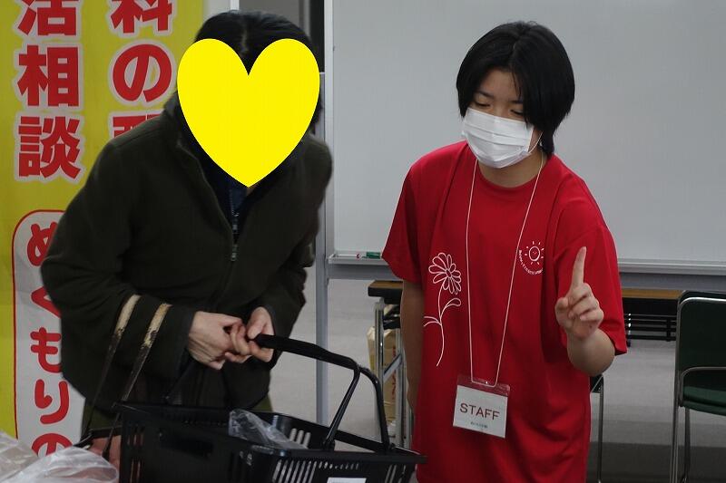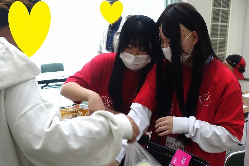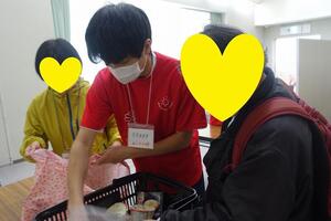 《部員感想(抜粋)》今回は、食品をエコバック等に入れるお手伝いの担当だったので、積極的に話しかけることを心掛けた。「前回はなかった調味料などがあるのは嬉しい」と話されていて、こちらも嬉しい気持ちになった。また、「どこから来られたのですか」と尋ね、様々な所から来られているということを知り驚いた。今後もこのボランティアに参加したいと思う。