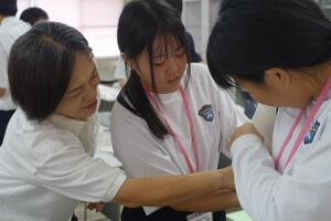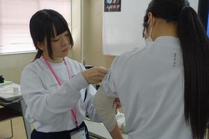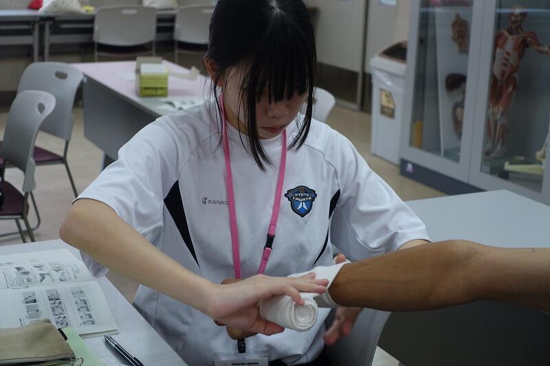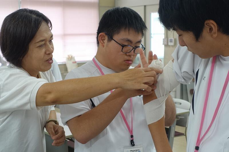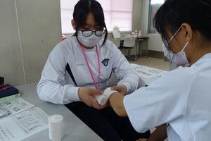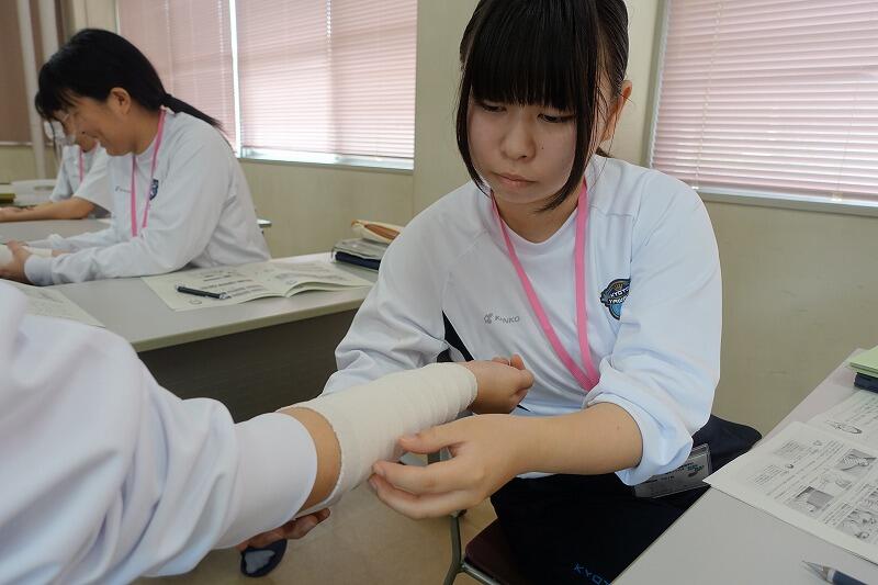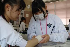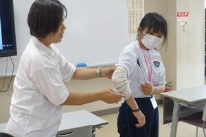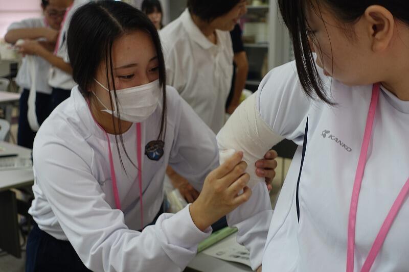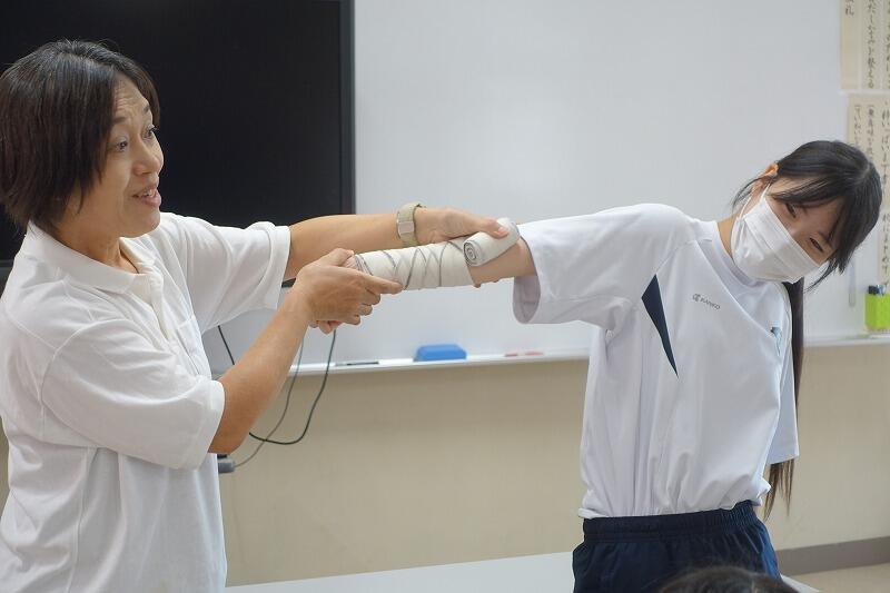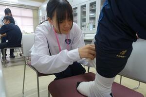 《生徒感想(抜粋)》包帯は、傷を癒したり、部位を固定するために使われると思っていたが、心理的にも使えることを知った。麦穂帯や亀甲帯のように途中で包帯の向きが変わる巻き方に苦戦した。包帯はアートという説明は、色々な巻き方に挑戦することで理解できた。他にも、三角巾をたちながら包帯する方法は、被災地などで生かせるので学べてよかった。