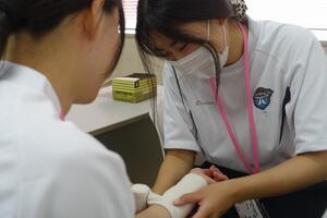 9月11日(木)3・4限、(専)京都中央看護保健大学校の阿形奈津子先生(副学校長)に講師として来ていただき、「巻軸帯の用途に応じた巻き方の手順」を学びました。「環行帯」「螺旋帯」「蛇行帯」「折転帯」「麦穂帯」「亀甲帯」の演習をしました。
