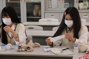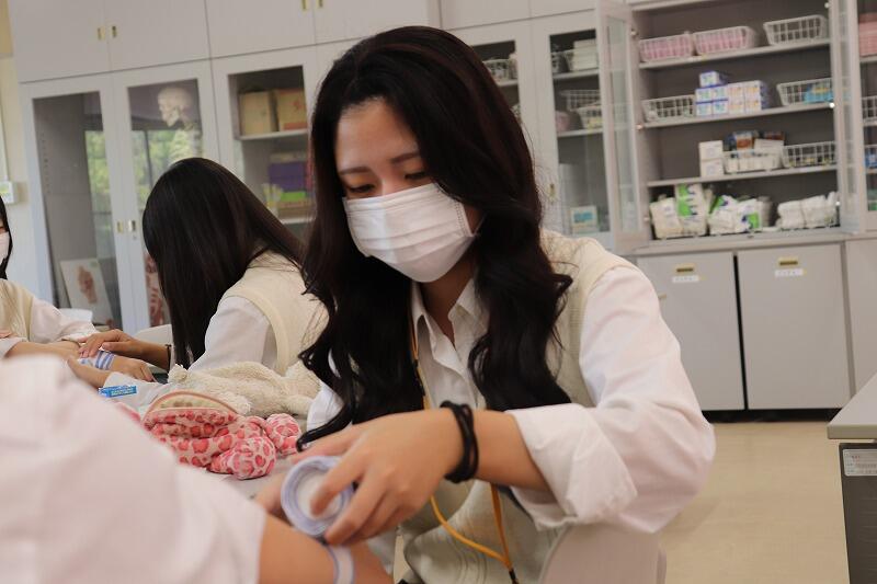 10月10日(金)3・4限、「人間科学」の授業で、2年生のときにはできなかった包帯法(巻軸帯)の演習を行いました。ゴムが入っていて伸縮性のある包帯だけではなく、伸縮性のない巻軸帯(ライン帯)も使いました。基本巻きと呼ばれる環行帯に加え、らせん上に巻いていく螺旋帯、折り返しながら巻く折転帯など、包帯の様々な巻き方について実践を通して学びました。