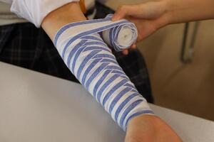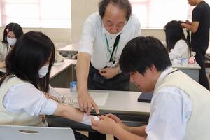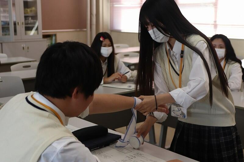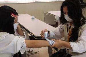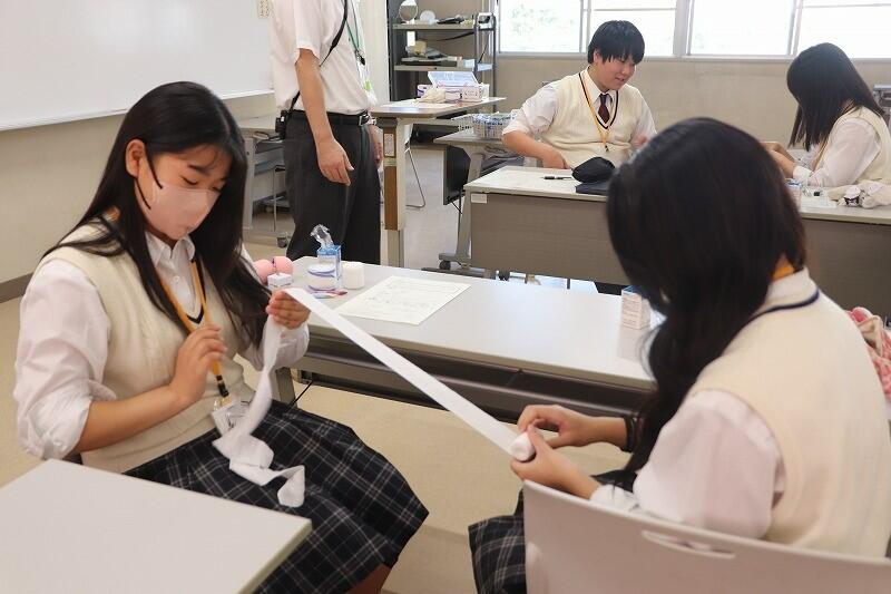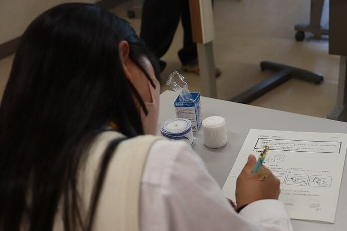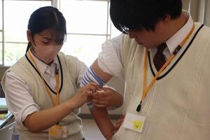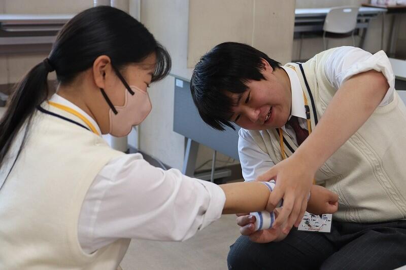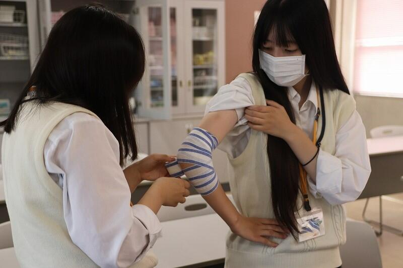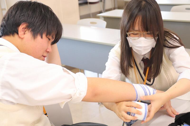普段包帯を使うときはゴムが入っている包帯しか使わないので、そうでないものは緩くなってしまい、怪我したところを止めにくいと思った。人の腕の太さによってもやりやすさが変わったので、慣れていくことが大事だと思った。包帯を巻くときに、腕の上で転がすように巻くと少し浮きにくくなるので、大切なことだと学んだ。/折り返し巻きをする時に、太さを均一にして折るのが難しく、肌が出てしまったり、緩んでしまったりした。練習を重ねて上手くできるようにしたい。包帯の巻き方をマスターして、自分が怪我したときだけでなく、誰かが怪我したときに助けられるようになりたい。