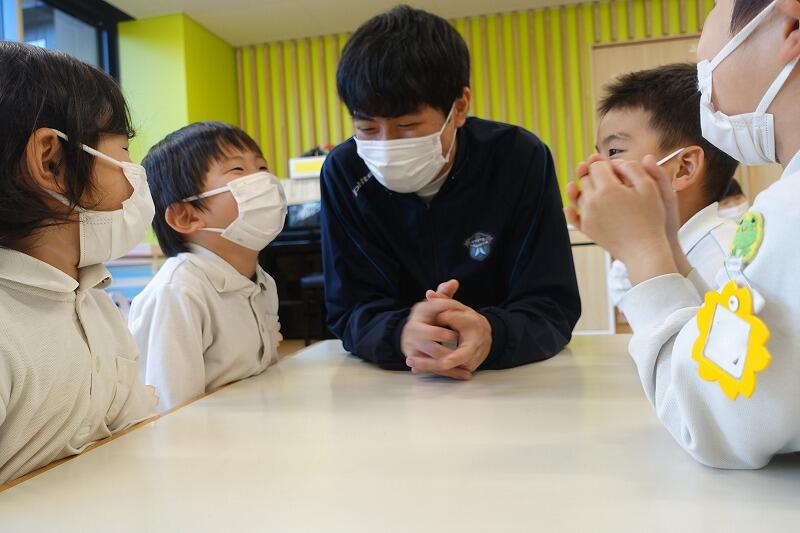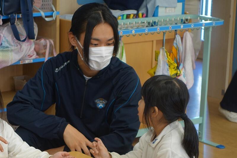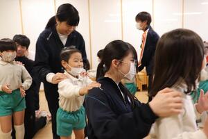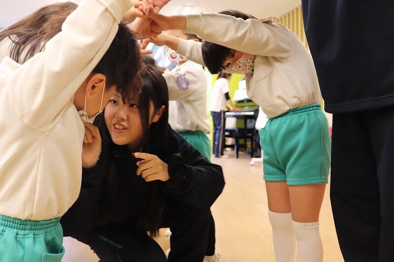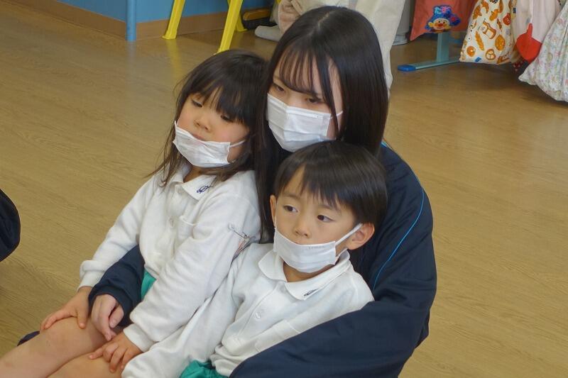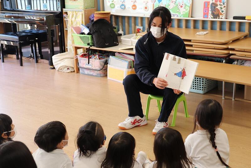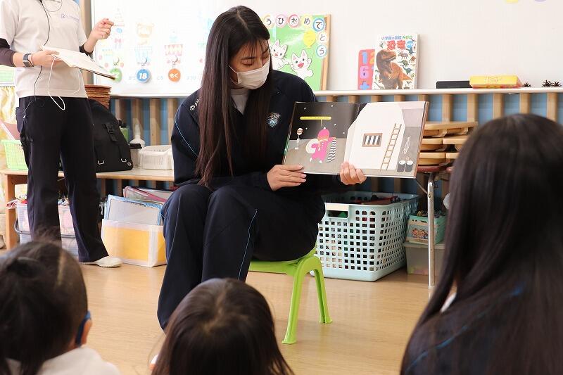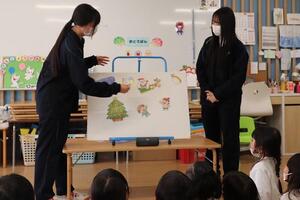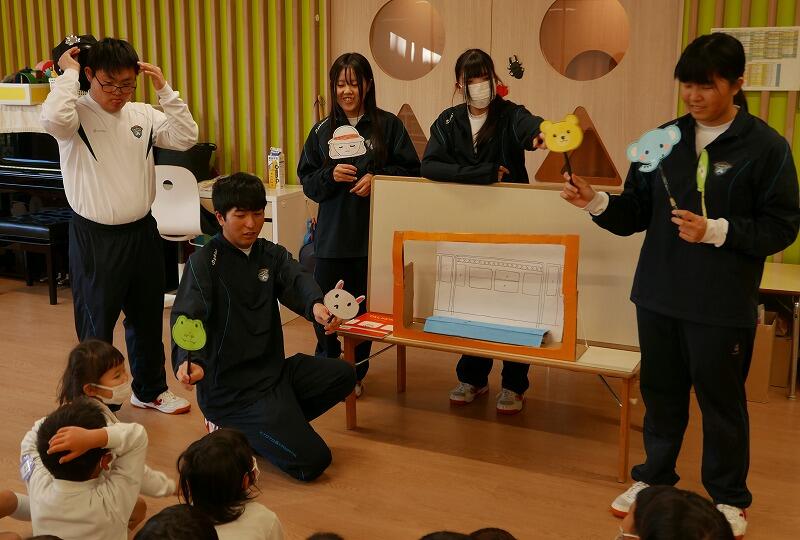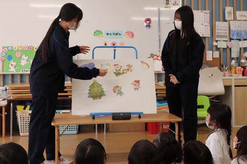 12月18日(木)4~7限、大阪国際大学との高大連携の実践の場として、附属の大和田幼稚園で「絵本を中心とした遊び」を発表しました。全6コマの事前学習、準備だけでは間に合わず、放課後に作業する姿が多く見られるなど、子どもたちのために一生懸命準備をする姿は、さすが人間科学科生だと思わせてくれました。当日は、大学のバスで移動し、学食での昼食後、幼稚園に移動し、おやつの時間に園児と交流しました。その後、約15分間の発表をし、大学へ戻って振り返りをしました。大学の方からも、子どもたちとの距離感、積極性、笑顔、目線を合わせる姿など、「高校生でここまでできるとは」と言っていただき、日頃の成果が表れた瞬間でした。