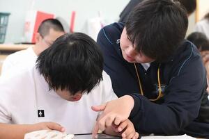 《生徒感想(抜粋)》アイマスク体験①を通して、視覚障がいだから何もすることができない、全てサポートしてもらわなければならないという訳ではないと分かった。視覚障がいであっても折り紙を折ることやサポートがあれば字を書くこともできる。視覚に障がいがある方=全てをサポートするのではなく、その人ができる事を理解したうえでサポートすることが大切だと分かった。また視覚に障がいのある方は、視覚以外の部分が鋭く、私たちが普段感じていないところまで感じているかもしれないと思った。