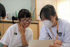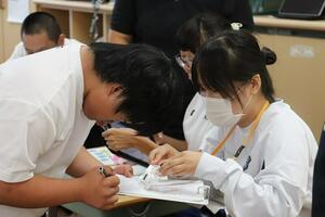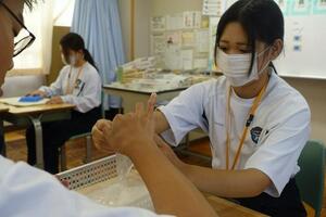 《生徒感想(抜粋)》 2週間前に血圧の測り方を学んだので覚えていると思っていたが、1回目の測定では明らかに違う値が出てしまった。改善点を考え、2回目に臨むと上手く測ることができた。この体験では、血圧の測り方を学んだのはもちろん、1回失敗しても、それを修正して成功できるようになることの大切さも学んだ。また、最高、最低血圧は人によって異なることから、多種多様な人がいることを改めて感じたので、今後は多様性の視点をもって生活していきたいと思った。