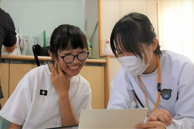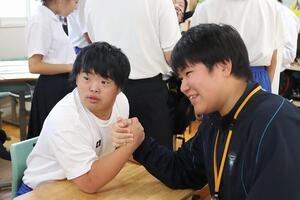 6月18日(水)3・4限、八幡支援学校小学部の児童と人間科学科1年生の初めての授業交流がありました。本校生徒が小学部の5クラスに分かれ、遊びの指導・生活単元学習の授業に入らせていただきました。各クラス、それぞれの授業テーマで一緒に活動しました。初めての授業交流でしたが、こどもと目線を合わす、笑顔で積極的に交流することを意識している様子が伺え、素敵な時間を過ごすことができました。後期の授業交流も楽しみにしています。