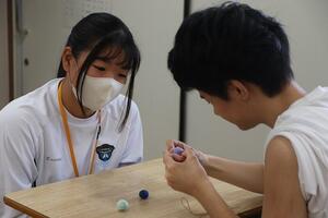 最後の交流で今までで一番腕を動かしたり、声を出して笑ってくれたりしてうれしかった。手を握ったり、声を掛けたりしてたくさん関わることができてよかった。/1曲みんなが好きな歌を流している間だけ集中して作業を行い、フェルトボールが出来上がったら自分の場所にシールを貼っていて1日で何個できたか分かりやすくなっていた。/制限時間内に終わるのかとても心配だったが、「こうしたらいいんじゃない?」「このイラストを使ったら分かりやすいかも」など話しながらしていると時間内に間に合って、ハイタッチをしてくれたのがうれしかった。