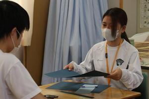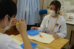 《生徒感想(抜粋)》前回の包帯法で学んだことがすべてできるようになっていたことが、とても嬉しかった。折転帯をペアでしたときに、「上手」、「綺麗」と声掛けをしてもらえたので、楽しく巻くことができた。ペアの人にはとても助けてもらった。誰が綺麗に巻けているかを見せ合ったとき、自分が巻いたものは幅も綺麗で上手にできたと思ったが、全員が綺麗すぎて自分はまだまだだと感じた。包帯法を学べる高校は少ないと思うので、自分のためにもなるとても貴重なことを学べたと思う。この体験を忘れず、いざというときのために、しっかりと生かしていきたい。