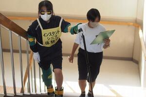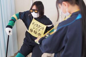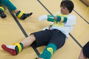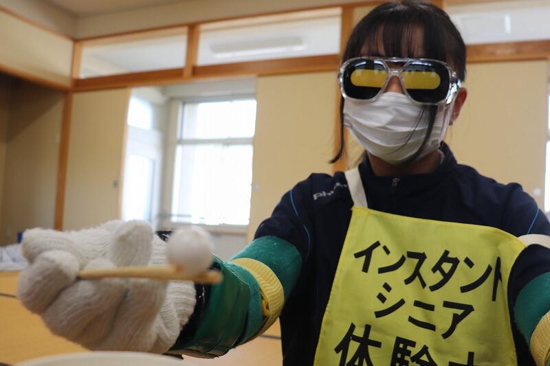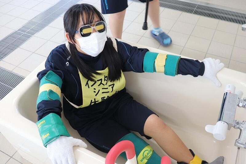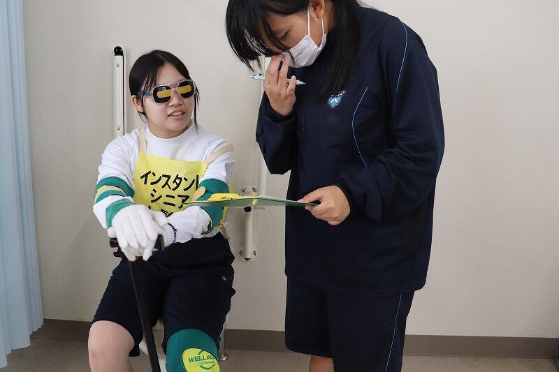 9月24日(水)3・4限、インスタント・シニア体験をしました。この体験の目的は、「高齢者の視点から社会を観察することで、社会環境の問題点を発見し、そのための対策やサポートを考える。」です。高齢者の感じる不便さを体験することで、高齢者を介助する上で大切なことを考える機会にします。白内障用ゴーグル・両腕関節サポーター・利き手首おもり・軍手・膝サポーター・左右重さの違う足首おもり・つえ・ゼッケンの装着の仕方を学び、今回は階段の上り下りを体験しました。