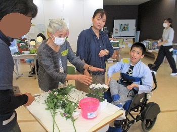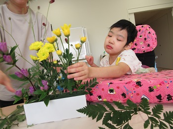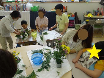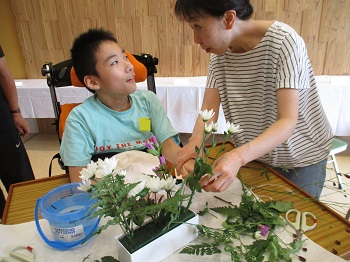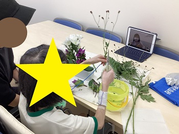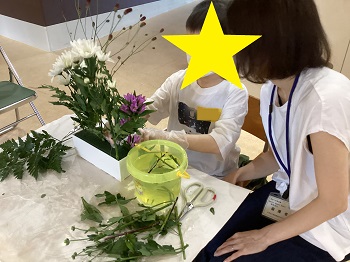 横長の花器に、花の表裏に気をつけ、足元をまとめず奥行きをもたせて真っ直ぐに生けるよう、講師の方からアドバイスを受けながら、取り組みました。