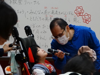 全校の取組と、中学部A組と、病棟で学ぶ児童の発表のリハーサルを行いました。