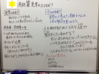 いつでも出動できるように、毎日道具等の点検があったり、整理整頓を徹底されていたり、体を鍛えておられたりすることなどに気付くことができました。そのなかで、「24時間の勤務や訓練が大変そうだ。」と考えを深めていました。
