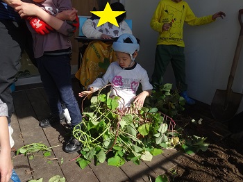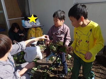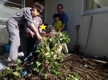 芋づるを束ねてみんなでしっかり掴んだら、「うんとこしょ、どっこいしょ!」と力を合わせてひきました。