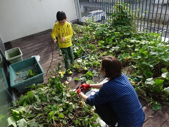 今日は、小学部が西校舎のテラスで育てていたサツマイモを掘りました
