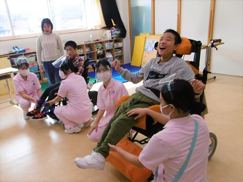 子どもたちにとって、療育センターではここ数日間接している看護学生たちが、行永分校で自分たちの学校生活を見てくれるというのも嬉しいようです。