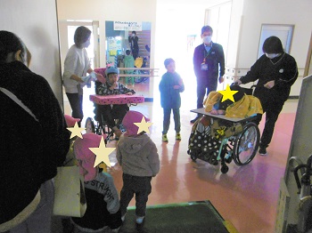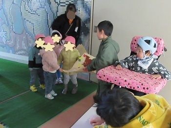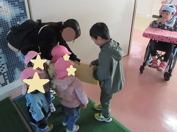 行永分校に隣接する医療センター内保育所の園児が、行永分校に2026年カレンダーを届けてくれました。