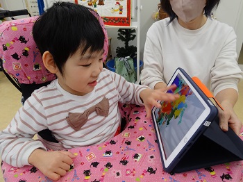 続いて、タブレット端末のペイントアプリを用いて、先程の折り紙の馬を貼るための台紙を作ります。白い画面を指や手のひらで触れると、「ポチョン!」と水が弾けるような音とともに、様々な色が白い画面に飛び散るように描かれます。子どもたちは、弾む音と次々と変化する画面を楽しんでいました。
