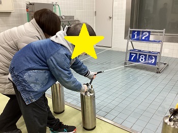 東消防署では、シアタールームで防災に関わる映像資料を見たり、消火器体験を行なったりしたほか、消防署内で署員の方々が事務をされている部屋や、仮眠室、緊急出動前のロッカールーム等、消防署の外からは見ることのできない所もたくさん見学させていただきました。