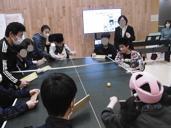 その後、卓球台を囲み、ラケットを手に持ったら、気分も高まり、打ち合うピンポン玉の動きに大盛り上がり。ピンポン玉をパスしたり、スマッシュの合図を送ったりと、お互いに声を掛け合いながら、楽しむ姿がステキでした。