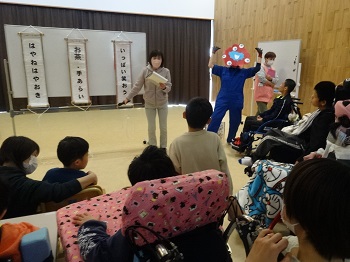 終業式後、「冬休みのくらし」についての話がありました。その時、子どもたちの前に現れたのは、なんとミャクミャク!今回は、ミャクミャクと一緒に、健康的な冬休みの過ごし方(早寝・早起き、お茶・手洗い、たくさん笑ってNK細胞を増やす)について確認しました。