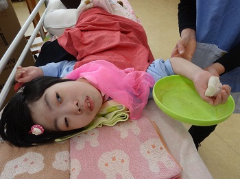 固まりができたら、お皿に移し、今度は、団子の形に整えます。指導者と「こんな感じかな。」と確かめながら作っていきました。