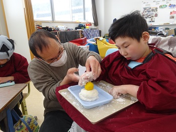 餅が手にくっついたり、びよ~んと伸びたりして楽しみながらかわいい鏡餅ができました。